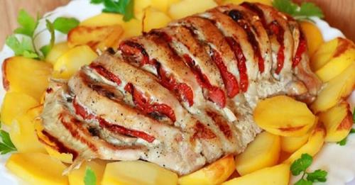 Pieczona rolada wieprzowa nadziewana boczkiem i grzybami z sokiem pomidorowym!