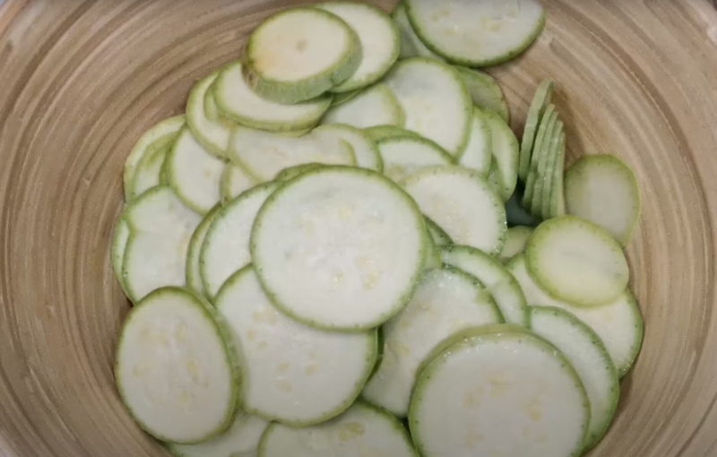 Cukinię pokrój na jak możliwie cienkie plastry, najlepiej wybierz młodą cukinię, tak aby na środku nie było pestek. Jeśli masz duże cukinie, pokrój je na pół pierścienia.