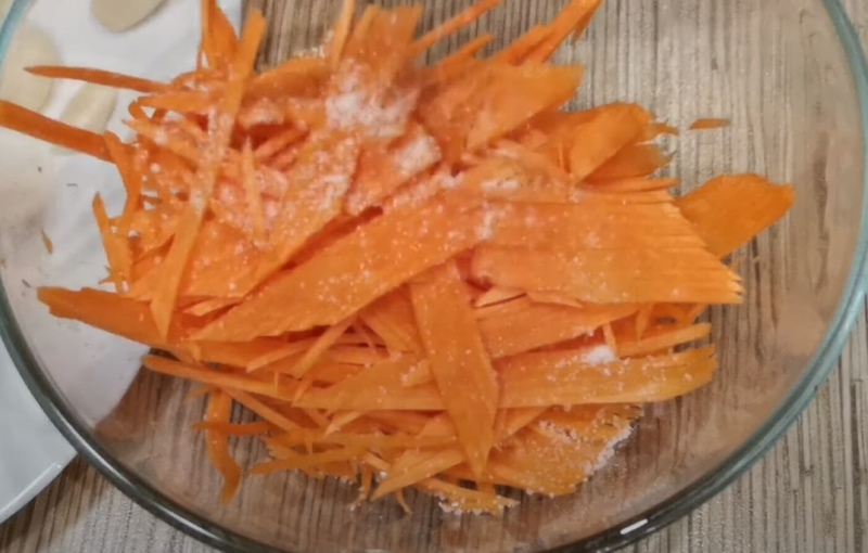Marchewkę obierz i pokrój w paski. Jeśli masz specjalną tarkę do marchewki po koreańsku, użyj jej. Przełóż marchewki do osobnej miski i dodaj 1 szczyptę soli. Wymieszaj i odstaw na 30 minut.
