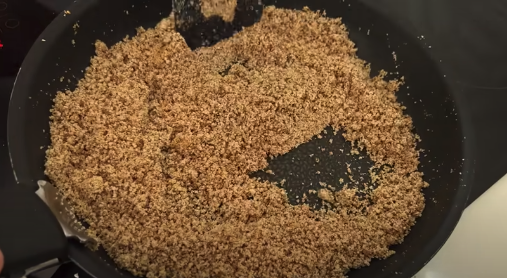 Zmiel migdały na mąkę migdałową. Podpraż mąkę migdałową na małym ogniu, aż nabierze złotego koloru. Pozwól jej ostygnąć. W misce wymieszaj podprażoną mąkę migdałową, masło i 40 gramów erytrytolu. Dokładnie wymieszaj, aż składniki się połączą. W drugiej misce ubij śmietankę 33% tłuszczu z 10 gramami erytrytolu, aż powstanie gęsta masa. Dodaj serek śmietankowy i kontynuuj ubijanie, aż masa będzie gładka i puszysta.