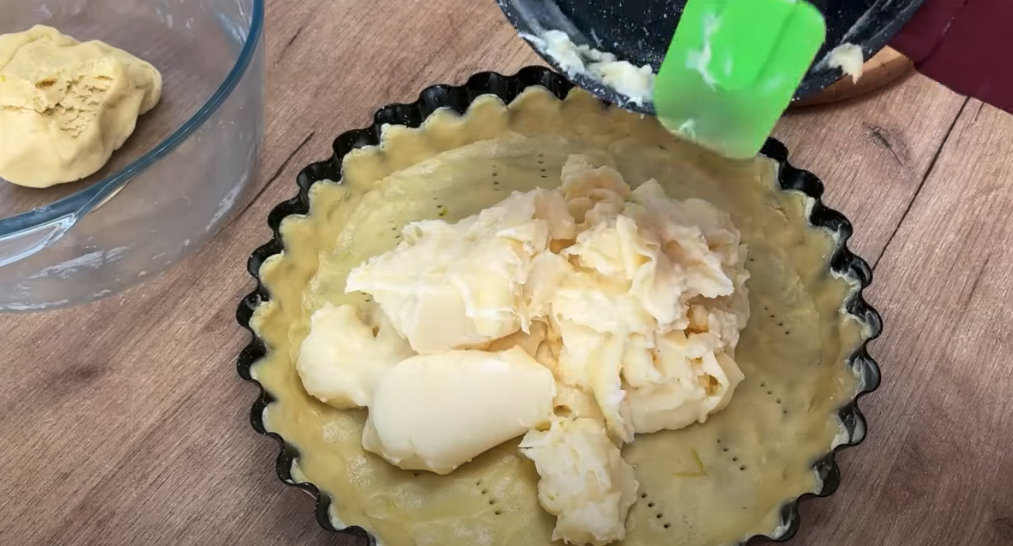 - Rozwałkuj ciasto i wyłóż nim formę o średnicy 26 cm.