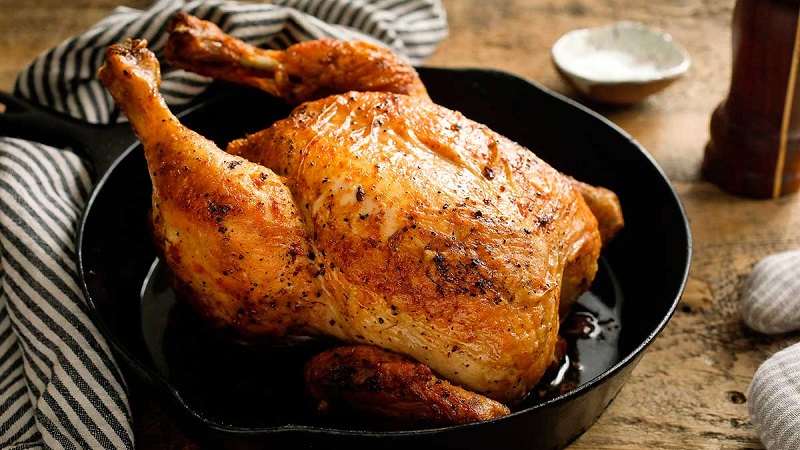 Natrzyj tuszę mieszanką, a następnie podsmaż ją przez 5 minut na patelni z obu stron. Umieść mięso w piekarniku i piecz kurczaka, aż będzie gotowy w 180 ° C. Jego smak okaże się po prostu niesamowity!