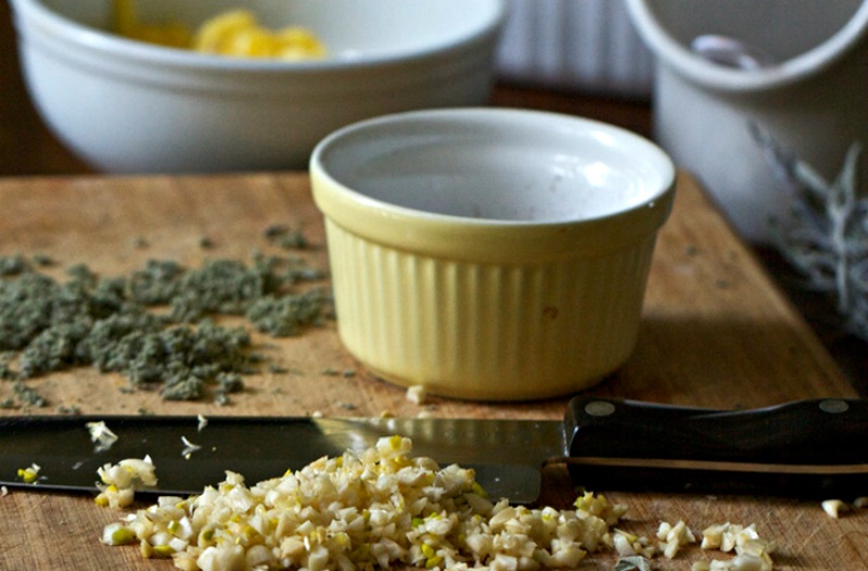Posiekaj za pomocą blendera parę gałązek kolendry i mięty, ząbek czosnku, plasterek świeżego korzenia imbiru, odrobinę papryki chili i sok z limonki. Dodaj miękkie masło, szczyptę mielonego pieprzu i sól do mieszanki.