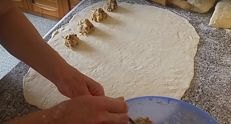 Rozwałkuj ciasto na cienki placek. Posyp mąką. 5-6 cm od brzegu ciasta ułóż na cieście w jednym rzędzie kulki z farszu.