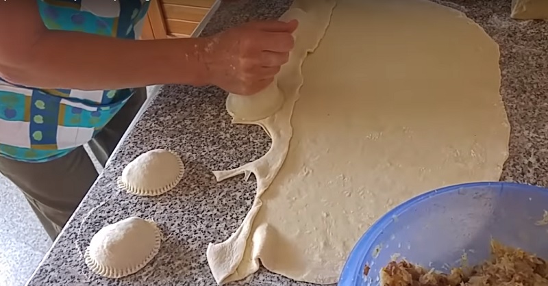 Następnie przełóż je brzegiem ciasta. Dociśnij palcami ciasto pomiędzy farszem, formując pierogi. Przy użyciu szklanki z cienkim brzegiem wytnij pierogi.