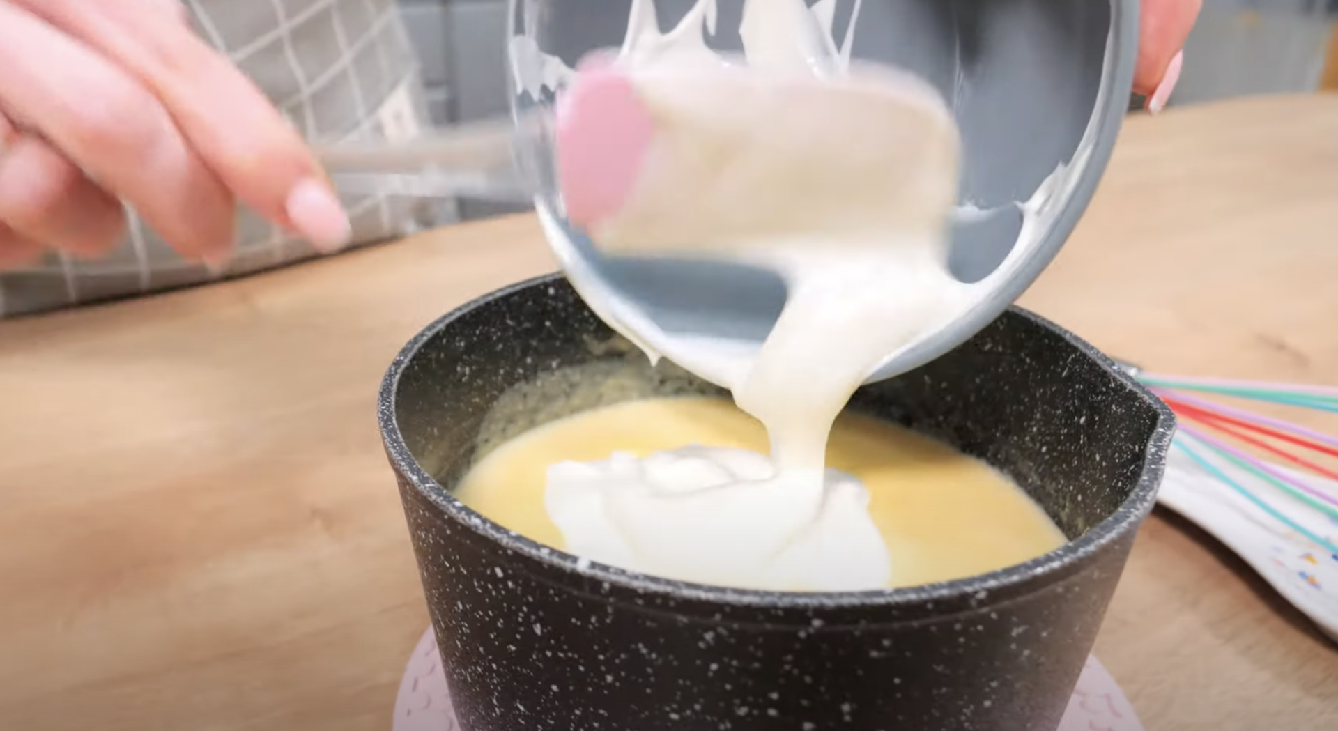 Zdejmij z ognia i dodaj żelatynę, wymieszaj. Wymieszaj także śmietanę z cukrem i z mieszanką jajeczną.