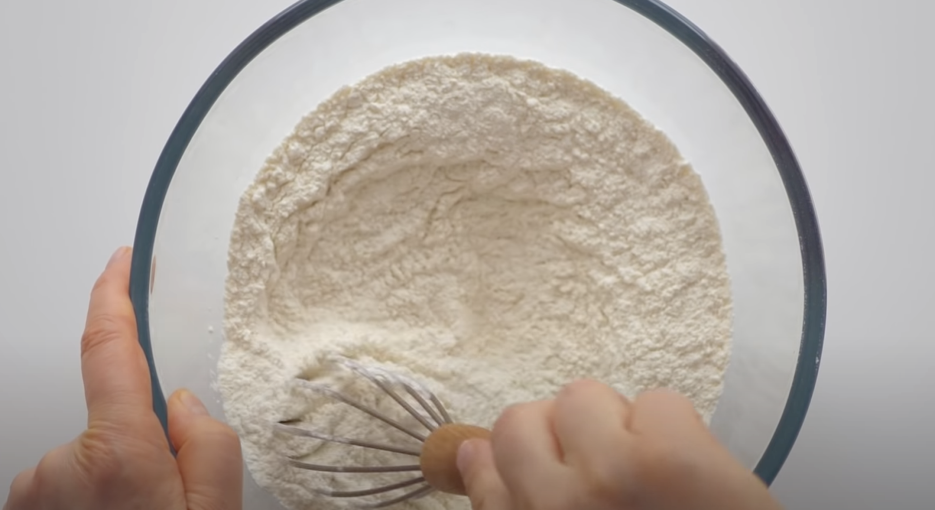 Nasmaruj olejem lub masłem formę do pieczenia o średnicy 27 cm i posyp mąką. W misce wymieszaj przesianą mąkę z proszkiem do pieczenia.