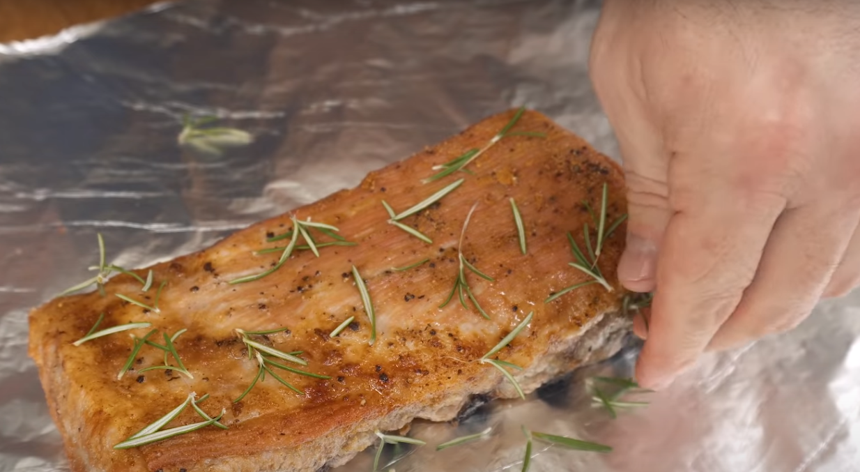 Po upływie 30-40 minut piec w temperaturze 200°C na ustawieniu góra/dół. Piec jeszcze przez godzinę, a następnie wyjąć blachę i posypać rozmarynem. Zawinąć w folię.