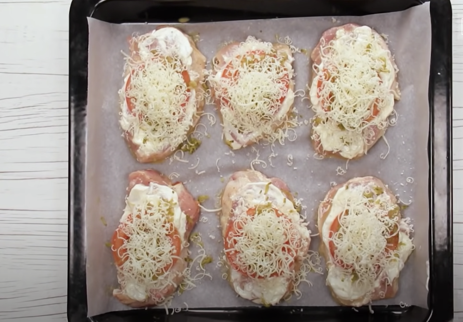 Posmaruj śmietaną lub majonezem. Ułóż na mięsie pokrojone pomidory i ogórki kiszone. Na koniec posyp serem.