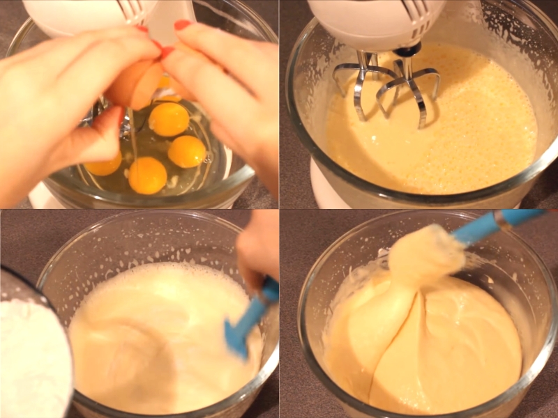 Rozbij jajka do osobnego pojemnika i ubij je mikserem z bardzo gorącą wodą, aż pojawią się duże bąbelki. Dodaj cukier i znów mieszaj. Następnie dodaj mąkę i wymieszaj łyżką