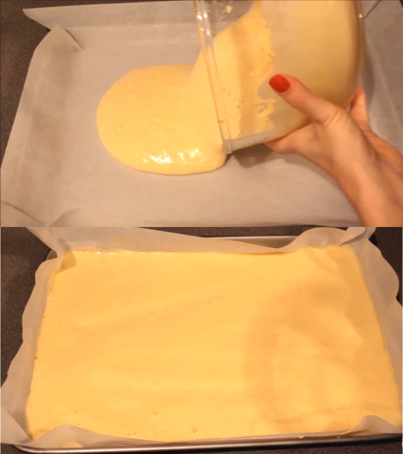 Smarujemy blachę do pieczenia masłem, układamy papier do pieczenia, następnie wylewamy na nią ciasto i wkładamy do rozgrzanego piekarnika na 12 minut