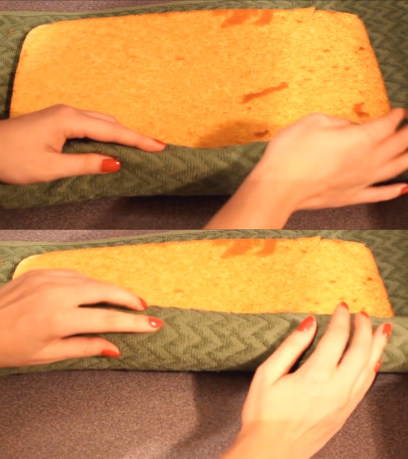 Wyjmij gotowy placek z piekarnika na ręcznik lub matę silikonową i zwiń z ręcznikiem w luźny wałek. Ostudź przez kilka minut