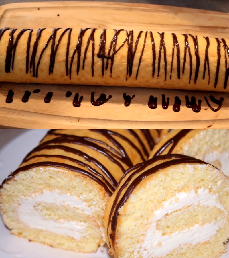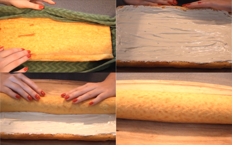 Ostudzone ciasto delikatnie odwiń, posmaruj nadzieniem, ponownie zwiń, owiń folią spożywczą i wstaw do lodówki na 2 godziny
