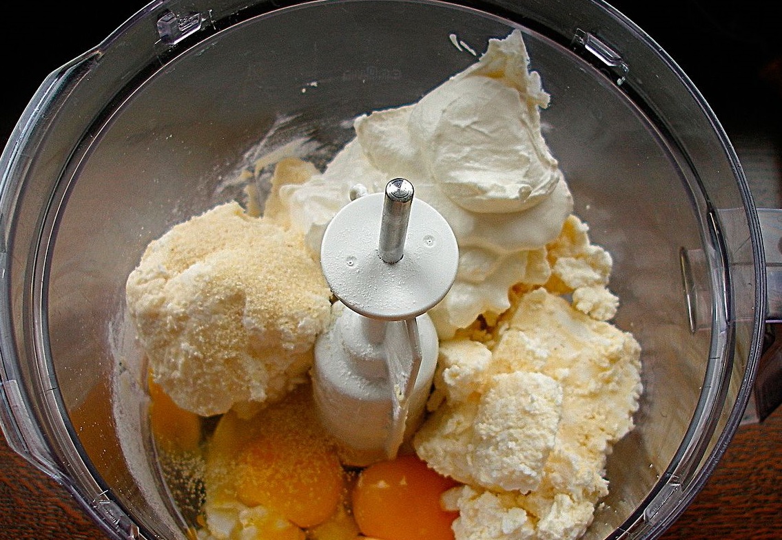 4. W oddzielnym naczyniu wymieszaj twaróg z pozostałym cukrem, cukrem waniliowym, śmietaną i jajkiem.