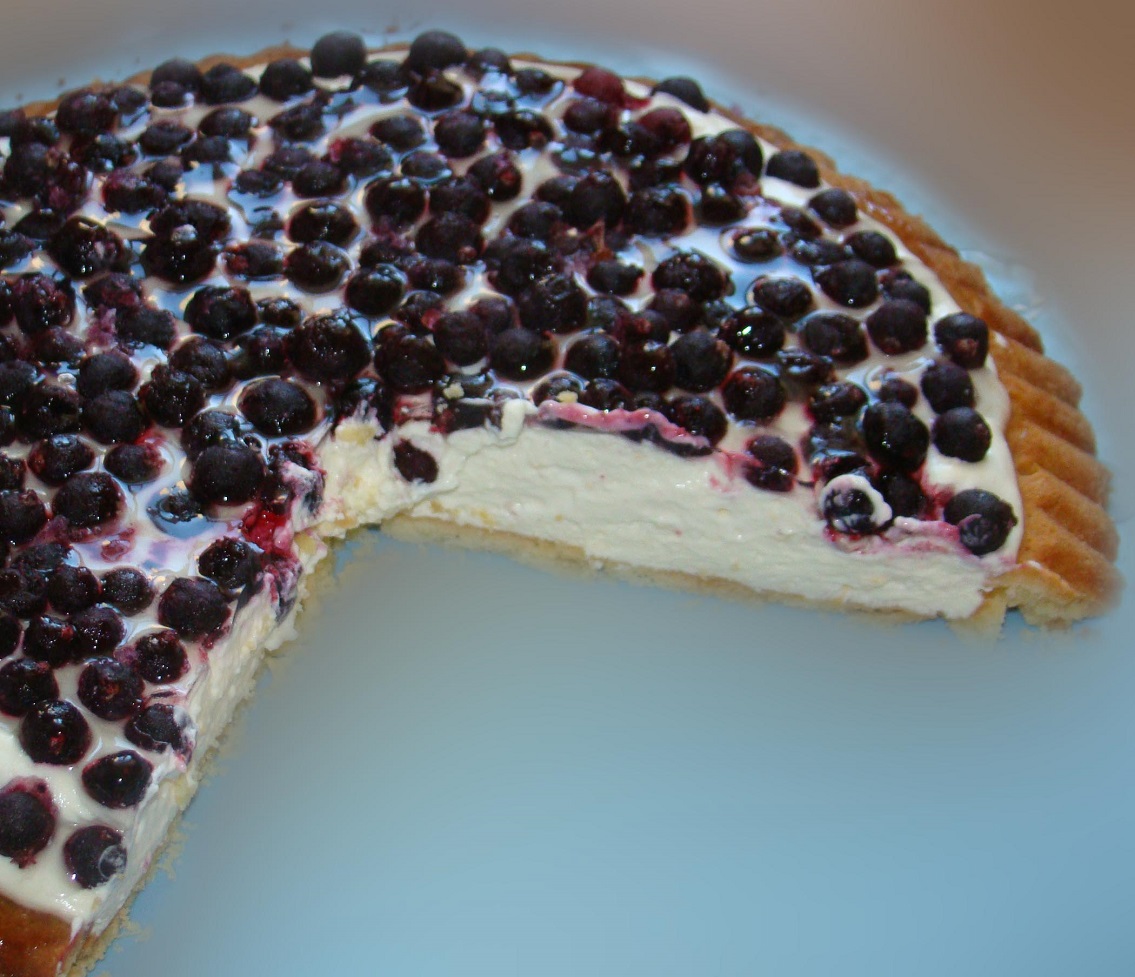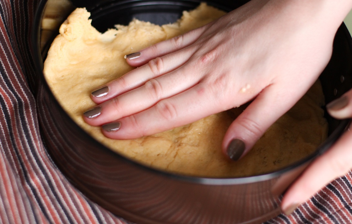 5. Ciasto rozłóż w formie. Stwórz boki około 4-5 cm. Na tak rozłożone ciasto wylej masę serową i rozłóż na wierzchu owoce. Piecz przez 40 minut w 180ºC.