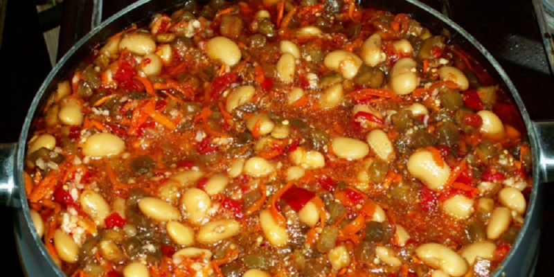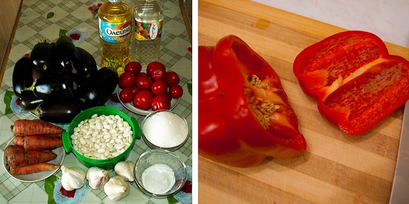 Fasolę namocz wcześniej, a potem ugotuj do miękkości. Bakłażany i paprykę pokrój w średniej wielkości kostkę, a cebulę na półpierścienie. Zetrzyj marchewki na tarce o średniej wielkości oczkach i drobno posiekaj zioła i czosnek. Przemiel pomidory przez maszynkę do mięsa.