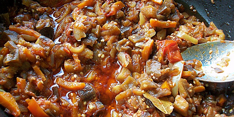 Podsmaż cebulę na oleju, następnie dodaj marchewkę. Dodaj również koncentrat pomidorowy. Do głębokiego garnka włóż paprykę i bakłażana, gotuj na wolnym ogniu przez około pół godziny, do momentu aż warzywa będą miękkie.