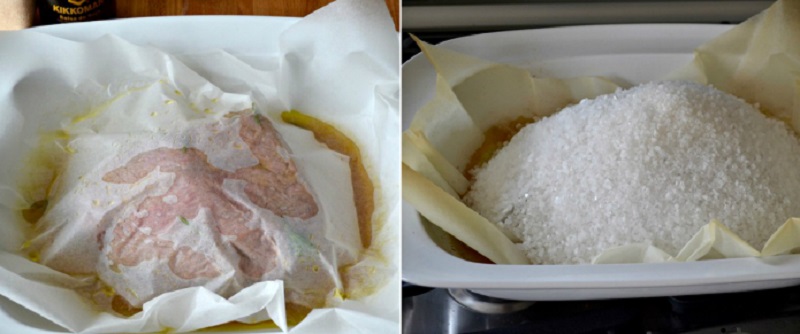 Do formy z wyższymi bokami do pieczenia włóż mięso i nalej marynaty. Koniecznie musisz przykryć pieczeń pergaminem, na którym umieścisz sól.